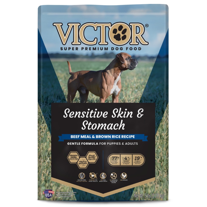 VICTOR’s Sensitive Skin and Stomach Beef Meal & Brown Rice Recipe is ideal for dogs with sensitivities or allergies.