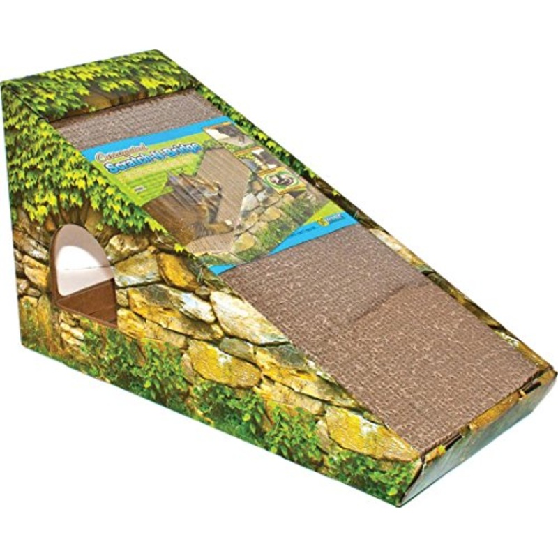 Curious kitties love to scratch the bridge on top and play in the hide-out underneath. Cats will love scratching the slanted corrugated cardboard surface and finding the irresistible crinkle sound toy under the bridge.