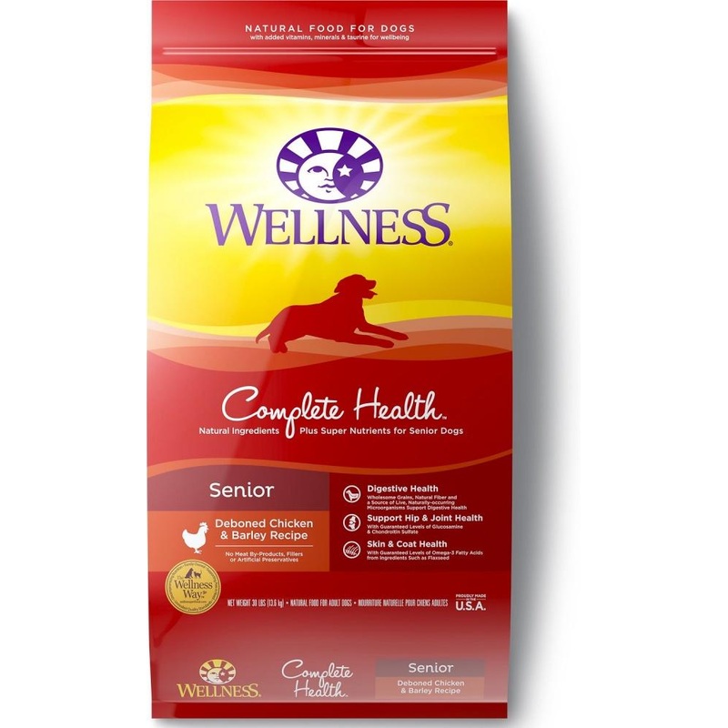 Wellness Complete Health Natural Senior Health Chicken Recipe Dry Dog Food helps maintain healthy body weight because it contains 9% fewer calories than Wellness Complete Health Adult Chicken & Oatmeal formula. Sources of glucosamine hydrochloride and chondroitin sulfate are added to help maintain hip and joint health. Wellness uses wholesome grains and natural fiber to help maintain a healthy intestinal tract, and this recipe contains a source of live, naturally-occurring microorganisms. Healthy Body Mass is key for your aging dog so Wellness ensures high-quality animal protein sources like Deboned Chicken and Chicken Meal to help build and maintain lean muscle mass.
