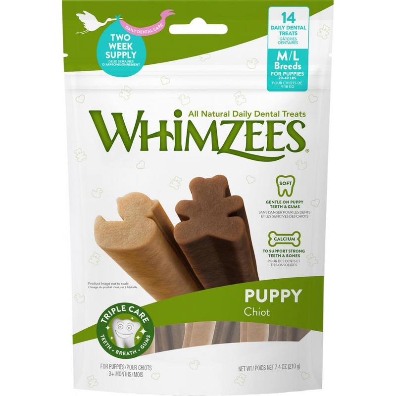 WHIMZEES puppy treats are designed to help clean teeth and reduce plaque and tartar through your pups chewing action. A natural, healthy introduction to daily dental care, our puppy treats are softer than our adult WHIMZEES Stix and come in 2 fun shapes yo