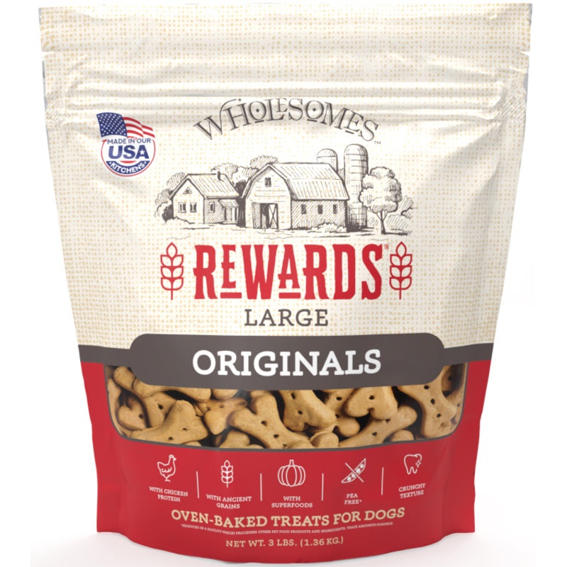 Reward your dog with new Wholesomes Rewards Large Originals Biscuit Dog Treats. Made in family-owned, USA kitchens with high quality chicken protein along with ancient grains for heart health, and superfoods like pumpkin, oatmeal, and sweet potato for a fi