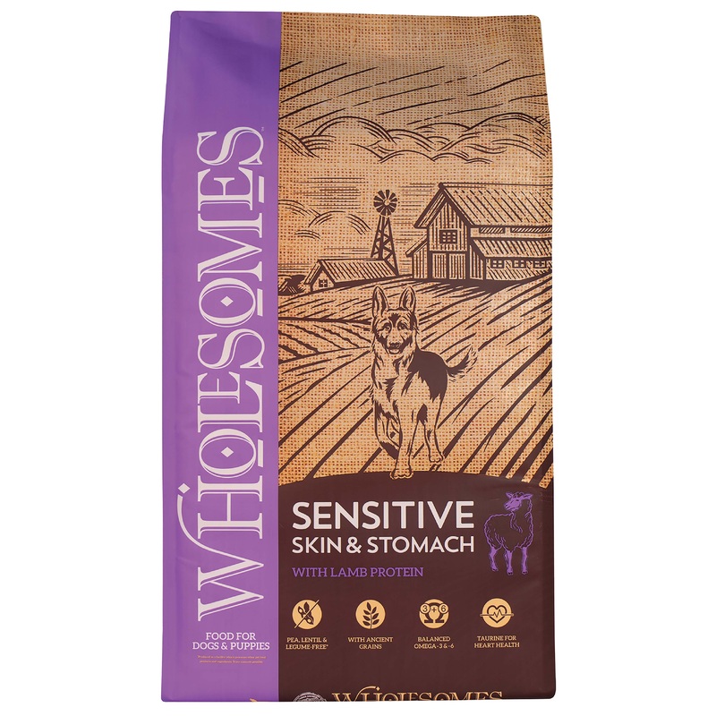 Just like people, some dogs can struggle with digestive health. An easy fix could be a simple switch of food. Wholesomes Sensitive Skin & Stomach with Lamb Protein was formulated with care to help your dog stay on a positive course of health throughout all stages of life. Packed with easily digestible proteins and quality sources of fiber, this dog food for sensitive stomach and skin will support any puppy or adult dogs unique dietary needs.