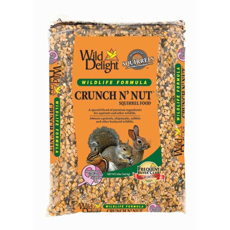 Wild Delight Crunch N' Nut Squirrel Food is a special blend of premium ingredients designed to attract squirrels, raccoons, ducks, geese, chipmunks and other outdoor pets.Guaranteed AnalysisCrude Protein (Min)6.00%Crude Fat (Min)4.00%Crude Fiber (Max)9.00%
